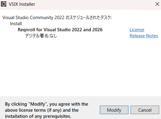 インストールして、Visual Studioを再起動すると、VSIX Installerが起動するため、Modifyを選択します。